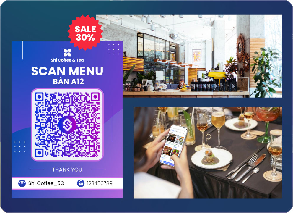Mã QR Thực Đơn Công Nghệ sinh ra tự động khi bạn tạo mã bàn trong mục thiết lập bàn. Bạn chọn mẫu tải về để dán bàn, khách hàng quét khi cần gọi món và gọi nhân viên, thay thế hoàn toàn thực đơn giấy truyền thống.